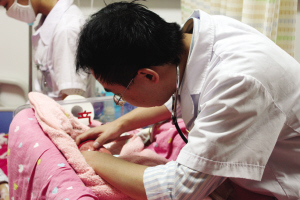 在產(chǎn)科的一間病房里,記者看到一個(gè)兒科醫(yī)生正在小心的用棉簽清除著一個(gè)新生兒口腔中的異物,新生兒的母親躺在他們身后的病床上安靜的看著,臉上露出開心的笑容。