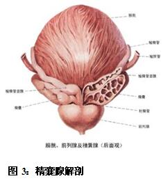 1、精囊腺的解剖及功能: 精囊腺位于膀胱底與直腸之間,在輸精管末端的外側(cè)。是一對(duì)長(zhǎng)橢圓形的囊狀器官,表面凹凸不平,下端為排泄管,與輸精管末端匯合成射精管(圖3)。精囊腺分泌精囊液(果糖、凝固蛋白Semenogelin 1,前列腺素等),成為精液的一部分。精囊能儲(chǔ)存少量精子,且有豐富微血管,極易損傷出血;性高潮射精時(shí),平滑肌強(qiáng)烈收縮,微血管破裂出現(xiàn)血精。