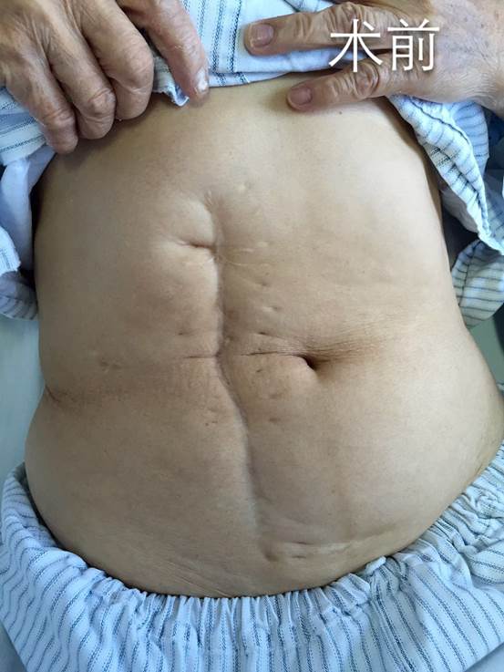 腹腔鏡手術(shù)雖好,但是對于有腹部多次手術(shù)史、腹腔廣泛粘連的患者來說,由于腹腔解剖結(jié)構(gòu)改變,腹腔鏡手術(shù)倒變成了雷區(qū)。近日,肝膽外科收住了一位老年患者,進(jìn)院時已出現(xiàn)了腹痛、發(fā)熱、黃疸。進(jìn)一步檢查后顯示,患者膽總管結(jié)石阻塞膽管,膽道擴(kuò)張,肝功能差,急需手術(shù)治療(見圖1)。然而這位患者似乎有些“命途多舛”,在這之前她就曾因膽管結(jié)石、腸梗阻在外院作了三次大手術(shù),所以腹部留下了整整長約30CM的手術(shù)疤痕(見圖2)。外院的醫(yī)生了解到該情況后建議直接“開刀”,患者通過打聽得知我院腹腔鏡技術(shù)精湛,遂慕名而來。