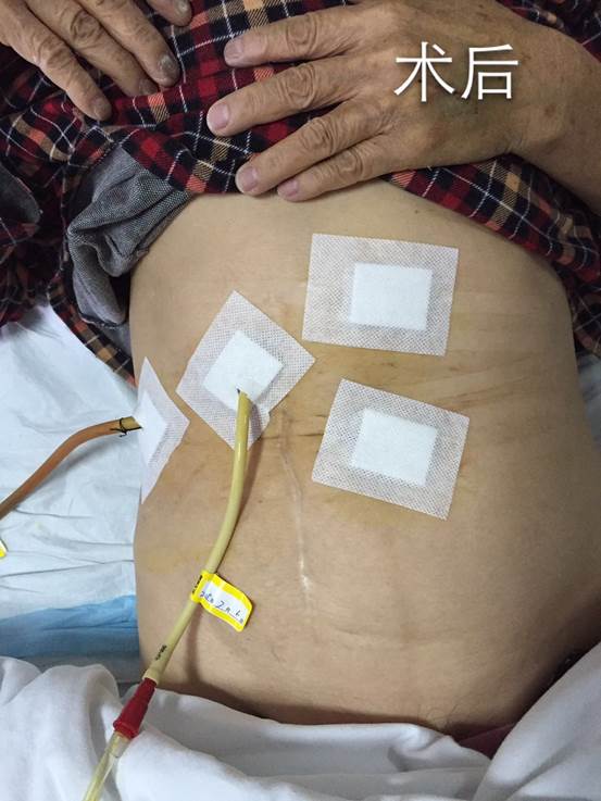 術(shù)后第二天,患者便可下床活動(見圖3),她高興地拉著醫(yī)護(hù)人員的手說:“以前我的肚子就是個“拉鏈”,被不停地拉開、關(guān)上,留下刀疤不說,每次手術(shù)都得在床上痛苦地躺十天半個月,這次手術(shù)我第二天就可以下床走動了!太感謝你們了!”