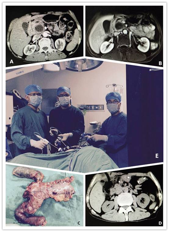 我院成功開展首例腹腔鏡輔助胰十二指腸切除術 發(fā)布時間:2016年7月6日 預覽:2091次 近日,胃腸外科成功開展了我院首例腹腔鏡輔助胰十二指腸切除術。 今年6月,我院胃腸外科收治了一名男性患者,因上腹部疼痛3年入院治療。術前影像學檢查腹部增強CT(如圖A)、腹部MRI(如圖B)。由于微創(chuàng)技術的突飛猛進,加上近幾年來積累的豐富經(jīng)驗,譚曙光主任帶領的胃腸外科微創(chuàng)團隊,果斷決定采用腹腔鏡輔助技術來完成此例手術。從建立氣腹、探查、游離顯露、小切口開腹吻合至關腹,總共歷時約6小時,完整地切除標本(如圖C),術后患者恢復順利,病理結果為胰腺假性囊腫,復查腹部CT(如圖D),術后14天患者順利出院。 胰十二指腸切除術由于其解剖復雜、毗鄰重要血管,為普通外科疑難手術之一,也是微創(chuàng)外科領域最難攻克的堡壘。微創(chuàng)胰十二指腸切除術,由于胰頭及壺腹部腫瘤部位解剖復雜,周圍有重要血管且血供豐富,手術涉及多個吻合口的重建,具有手術風險大、技術難度高等特點,是最具挑戰(zhàn)性的手術,同時也是備受爭議的手術。開展此類手術,外科醫(yī)生精湛的手術操作技巧、團隊配合是手術成功的關鍵。胃腸外科憑借譚曙光主任多年的手術經(jīng)驗、高超的腔鏡應用技術,以及一支優(yōu)秀的腔鏡團隊(如圖E),順利出色地完成了我院首例腹腔鏡輔助胰十二指腸切除手術。 目前,我院胃腸外科開展的腹腔鏡下胃腸道腫瘤手術的例數(shù)及其技術在湘南地區(qū)處于領先地位。該手術的成功開展,不僅體現(xiàn)了我院胃腸外科的整體實力,也標志著我院在微創(chuàng)外科技術層面又邁進了一大步。 (賀賽奇)