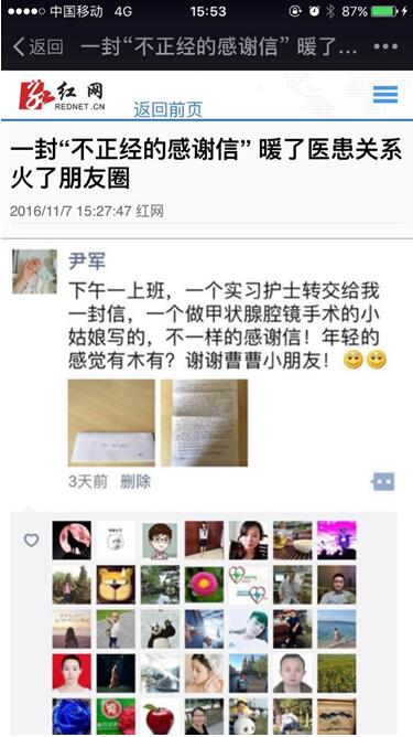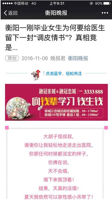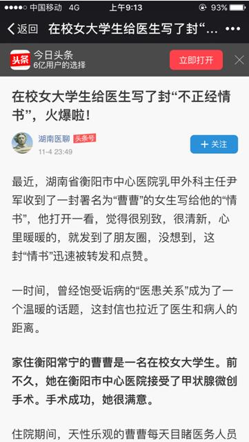 近日有一封患者寫給醫(yī)生的“不正經(jīng)情書”意外在網(wǎng)絡(luò)走紅,今日頭條網(wǎng)、搜狐網(wǎng)、騰訊網(wǎng)、網(wǎng)易、護(hù)士網(wǎng)等國內(nèi)主流媒體報(bào)道后引來幾十萬的閱讀量!