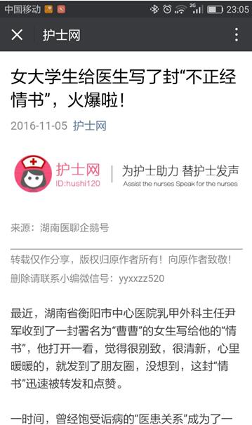 詳細(xì)過程是:乳甲科主任尹軍收到了一封署名為“曹曹”的女生寫給他的“情書”,他打開一看,覺