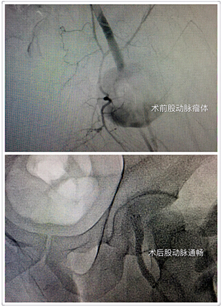 入院后檢查發(fā)現(xiàn)右側(cè)股動(dòng)脈血管瘤破裂,而且形成一個(gè)巨大潰瘍,出血洶涌,單純的加壓包扎不能挽救病人的生命。經(jīng)過(guò)協(xié)商討論后,血管外科組的涂宏副主任醫(yī)師犧牲休息時(shí)間,頂住壓力,毅然給患者行“破損股動(dòng)脈覆膜支架腔內(nèi)隔絕”手術(shù),手術(shù)順利止住出血,封閉瘤腔。(圖1)經(jīng)過(guò)幾日積極搶救,病人終于脫離了生命危險(xiǎn)。