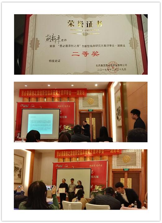 神內(nèi)科胡新平主任喜獲“恩必普原創(chuàng)之旅”創(chuàng)新型臨床研究方案評(píng)審會(huì)二等獎(jiǎng) 發(fā)布時(shí)間:2018年1月5日 預(yù)覽:2156次 通訊員劉立君報(bào)道: 12月29號(hào),在長(zhǎng)沙舉辦的“恩必普原創(chuàng)之旅”創(chuàng)新型臨床研究方案評(píng)審會(huì)上,我院神內(nèi)科胡新平主任以《丁苯酞聯(lián)合高壓氧對(duì)急性缺血性腦卒中側(cè)支循環(huán)的作用研究》為課題,經(jīng)過(guò)演講、匯報(bào)、專(zhuān)家評(píng)審等環(huán)節(jié)綜合評(píng)比,最終脫穎而出,喜獲二等獎(jiǎng)。 此次評(píng)審會(huì)參賽專(zhuān)家共計(jì)13人,分別來(lái)自中南大學(xué)湘雅醫(yī)院、湖南省人民醫(yī)院、長(zhǎng)沙市第一醫(yī)院、南華大學(xué)附屬第一醫(yī)院等省內(nèi)大型醫(yī)院,課題主要圍繞藥物丁苯酞對(duì)腦卒中的治療作用進(jìn)行研究。評(píng)審專(zhuān)家由中南大學(xué)湘雅醫(yī)院的肖波教授、楊曉蘇教授,中南大學(xué)湘雅二醫(yī)院的胡治平教授、中南大學(xué)湘雅三醫(yī)院的宋治教授、湖南省第二人民醫(yī)院的楊松林教授等湖南省神經(jīng)內(nèi)科領(lǐng)域具有重要影響力的教授組成。胡新平主任在評(píng)審會(huì)現(xiàn)場(chǎng),對(duì)自己的課題《丁苯酞聯(lián)合高壓氧對(duì)急性缺血性腦卒中側(cè)支循環(huán)的作用研究》進(jìn)行了精彩匯報(bào),經(jīng)過(guò)專(zhuān)家的認(rèn)真遴選,榮獲了二等獎(jiǎng)。 “恩必普原創(chuàng)之旅”是為探索腦卒中治療臨床研究中的新方向,提高腦卒中的治療水平,促進(jìn)中國(guó)創(chuàng)新型中青年醫(yī)生的成長(zhǎng),由恩必普藥業(yè)公司支持和開(kāi)展的一項(xiàng)中國(guó)原創(chuàng)藥物創(chuàng)新性臨床研究方案征集活動(dòng)。 胡新平主任的課題《丁苯酞聯(lián)合高壓氧對(duì)急性缺血性腦卒中側(cè)支循環(huán)的作用研究》在創(chuàng)新臨床研究方案評(píng)審會(huì)上的獲獎(jiǎng),將進(jìn)一步激發(fā)我院廣大醫(yī)務(wù)人員在科研方面的熱情和興趣,提高我院在湖南省神經(jīng)內(nèi)科領(lǐng)域的影響力。
