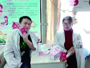 手拿獻血證的兩名呼吸內(nèi)科年輕醫(yī)生合影