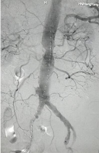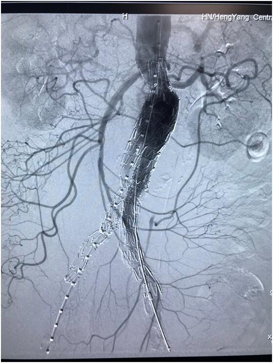 血管介入科行腹主動脈瘤覆膜支架隔絕術(shù)(“褲衩”支架植入)。圖2