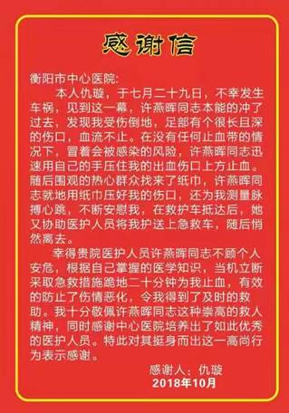 做好事后沒留名,聞訊錦旗送上門 發(fā)布時(shí)間:2018年10月26日 11:47:30 預(yù)覽:2222次 通訊員張永明報(bào)道:10月25日,門診辦公室意外收到一面錦旗和感謝信。事后了解得知是三個(gè)月前發(fā)生的一件隱姓埋名做好事感人的事情。 7月29日星期天上午,袁俊杰、仇璇兩夫妻帶著小孩騎摩托車從香格里拉小區(qū)出來,途中不幸被急馳的小車掛傷,造成左足跟部撕裂傷約16cm,流血不止。被巧遇從此路過的護(hù)士許燕暉看到和聽到呻吟聲,她迅速走近傷者面前,并及時(shí)讓旁邊人呼叫120,當(dāng)天上午近11點(diǎn)鐘,烈日當(dāng)空的地上滾燙,她依然穿著短裙赤腳跪在熱地板上20多分鐘不顧被傷者流血感染徒手壓著傷口上方止血,同時(shí)又測量傷者脈搏心跳,觀察面色有無異常,還不斷地安慰傷者,等120救扶車趕到才悄然離開。后經(jīng)傷者方多方打聽才得到基本線索,許燕暉認(rèn)為自己只是做了一件很平常的事,所以一直隱姓埋名三個(gè)月里從沒有言說。之后,傷者仇璇的愛人袁俊杰送病人到衡陽市中心醫(yī)院看病,在門診大廳無意間碰到了許燕暉,感覺面熟,最后從側(cè)面才得知確切的信息。10月25日,袁俊杰護(hù)著已經(jīng)出院多日但還沒有痊愈仍柱著拐杖的妻子前來衡陽市中心醫(yī)院門診辦公室送上錦旗和感謝信,以表真誠的感恩。許燕暉,雖然來衡陽市中心醫(yī)院門診部工作近一年,平常工作積極主動,微笑服務(wù),早出晚歸,樂于幫助病人,多次拾金不昧,應(yīng)對突發(fā)事件處置能力強(qiáng),溝通能力好,深受大家好評。