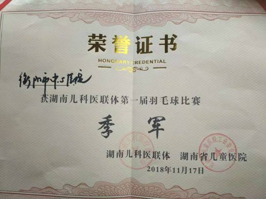 羽毛球代表隊喜獲湖南兒科醫(yī)聯(lián)體季軍 發(fā)布時間:2018年11月22日 12:41:30 預覽:2577次 蔣方明報道:11月16日—17日,劉志偉副院長帶領劉陽、王箭等衡陽市中心醫(yī)院羽毛球代表隊參加湖南兒科醫(yī)聯(lián)體第一屆職工羽毛球比賽,經過激烈比賽,喜獲比賽季軍。